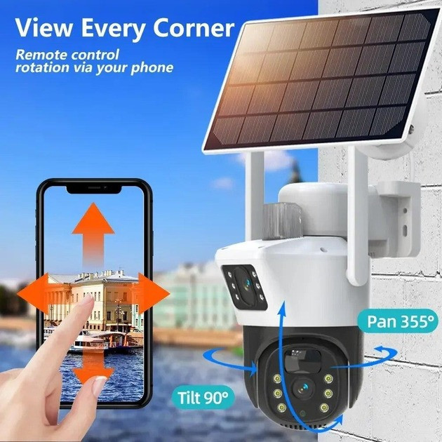 Широкий кут огляду та поворотний механізм (горизонтально 90°, вертикально 120°) забезпечують повний контроль над територією на 350°. Камера знімає в роздільній здатності 1080P Full HD вдень і вночі, а вбудована ІЧ-підсвітка та кольорове нічне бачення фіксують усі деталі навіть у повній темряві.