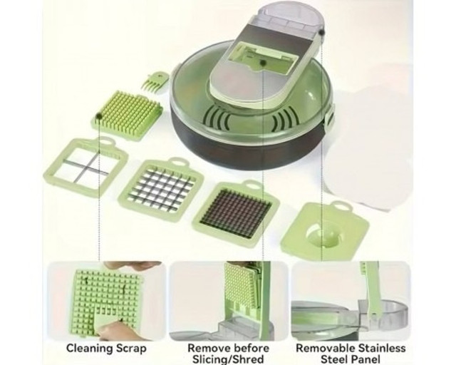 Вбудовані регульовані леза — вибирайте потрібну товщину та форму нарізання без заміни насадок.
