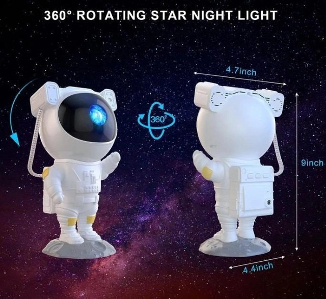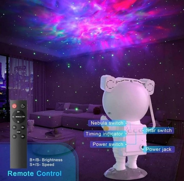 Лазерний проєктор Sky Star Astronaut Lamp у формі астронавта на Місяці перетворює дитячу кімнату на казкову галактику. Восьмиколірні зображення зоряного неба створюють ефект, що зачаровує світловий ефект, який підходить для сну, ігор, вечірки або сімейного кіно. Рухливість астронавта дає змогу регулювати напрямок проекції, змінюючи положення рук і нахил голови, щоб зірки висвітлювали саме ту частину кімнати, яку ви хочете.