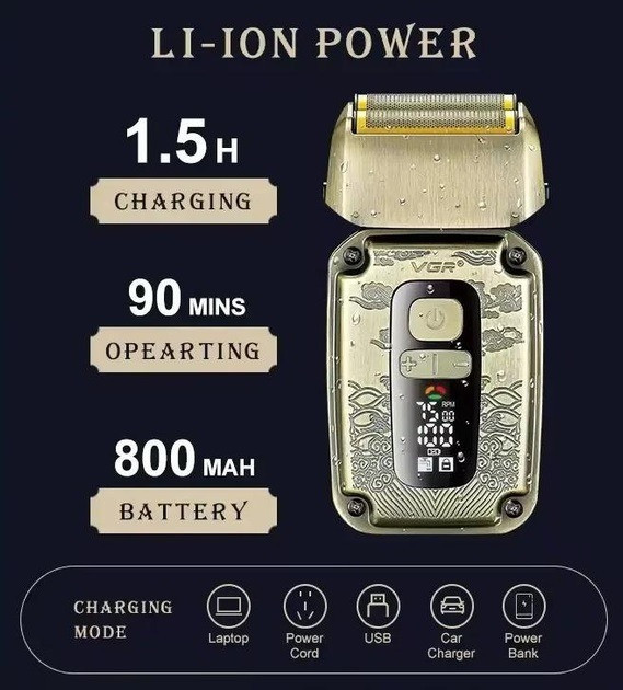 Електробритва VGR V-337 з LED-дисплеєм, тримером і двома насадками, для сухого та вологого гоління, акумуляторна
