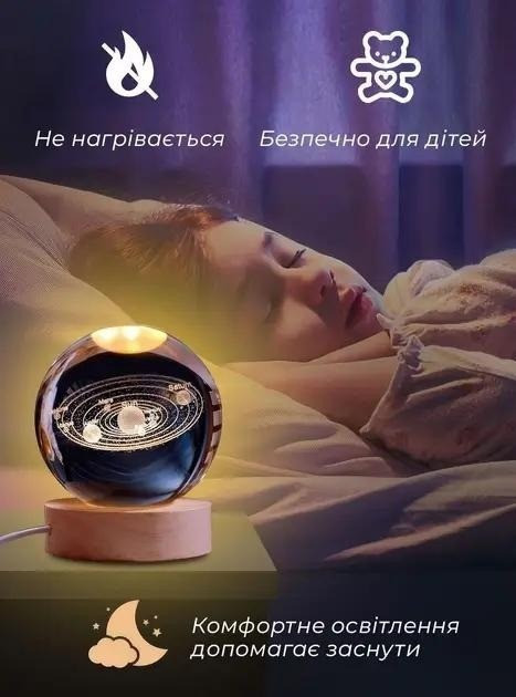 3D-нічник у формі кришталевої кулі із зображенням сонячної системи поєднує функціональність і стиль. Світлодіодна підсвітка м'яко розсіюється через скло, створюючи тепле затишне освітлення, яке допомагає розслабитися й створює атмосферу спокою в кімнаті.