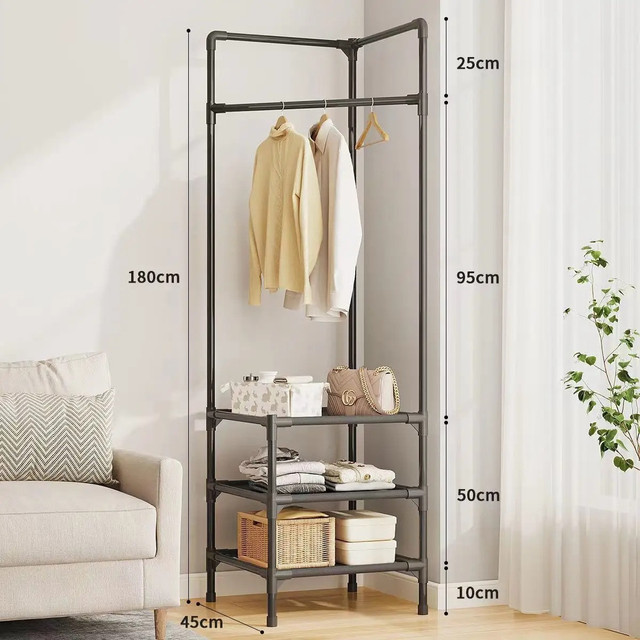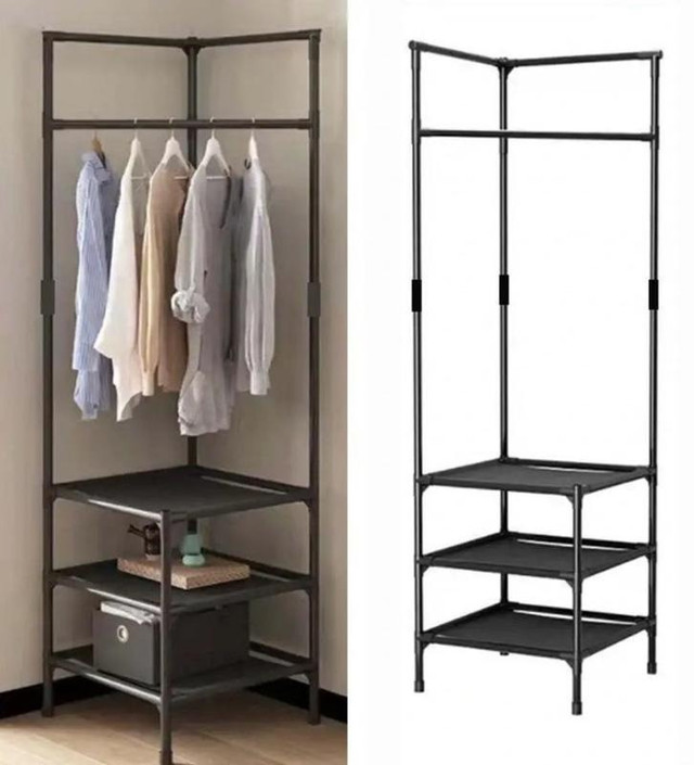 Ця кутова стійка допомагає максимально ефективно використовувати кут кімнати, створюючи акуратне та компактне зберігання. Відкритий дизайн забезпечує швидкий доступ до речей, а міцна конструкція з металу та пластику гарантує довговічність. Вішалку легко переміщати в інші приміщення, вона не вимагає свердління й електроінструментів для збирання.