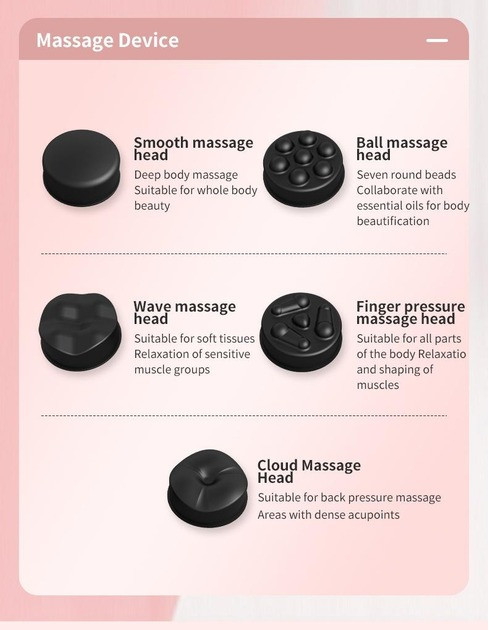 - Масажна насадка з пальцевого тиску: Підходить для всіх частин тіла, розслабляє й допомагає у формуванні м'язів.
