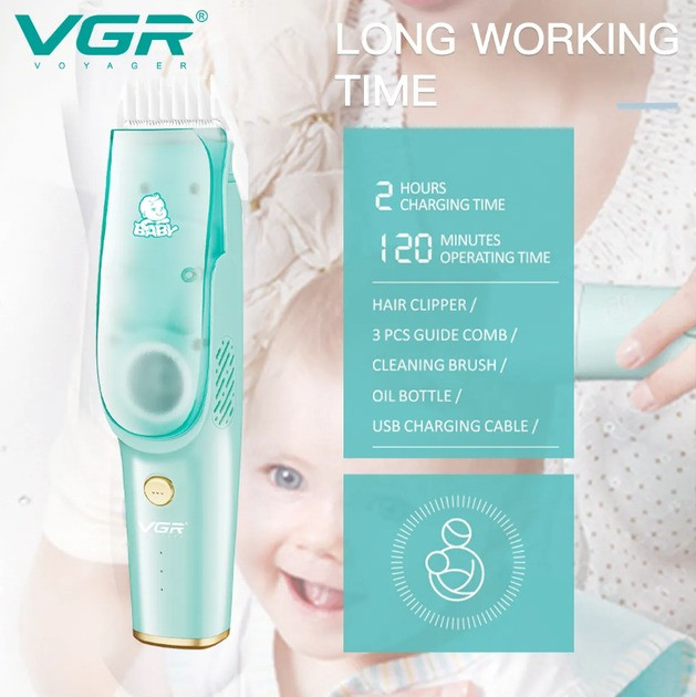 Дитяча безшумна машинка для стриження волосся VGR 151 Baby Hair Clipper — це спеціально розроблений пристрій для стриження волосся маленьких дітей без створення зайвого шуму та дискомфорту. Також у машинки передбачений зручний контейнер для збирання волосся, що дає змогу стригти вашу дитину в будь-якому місці, граючи.