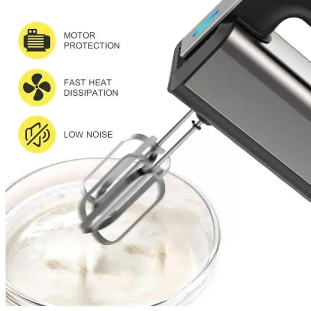 Миксер оснащён двома насадками з неіржавкої сталі: віночком для збивання та гаком для замішування тіста. Насадки легко знімаються, що спрощує догляд за приладом і дає змогу підтримувати чистоту на кухні.