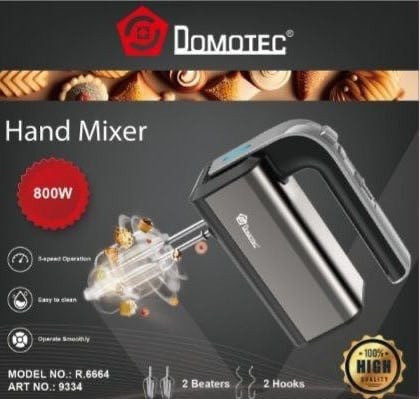 Ручний кухонний міксер Domotec R-6664 — універсальний і потужний прилад для збивання, змішування й замішування тіста. Потужний мотор 800 Вт и 5 швидкостей дають змогу точно регулювати інтенсивність роботи залежно від рецепта. Для делікатного збивання передбачений режим Пульс, а режим Турбо забезпечує миттєве збільшення потужності для густих сумішей.