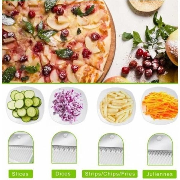 Овочерізка пропонує 40 параметрів товщини від 0,2 до 8 мм і 2 стилі нарізання, що дає змогу приготувати скибочки, кубики, соломку або брусочки. Пружинна технологія забезпечує легкість роботи, а вбудована система лез позбавляє їх їх змінювати.