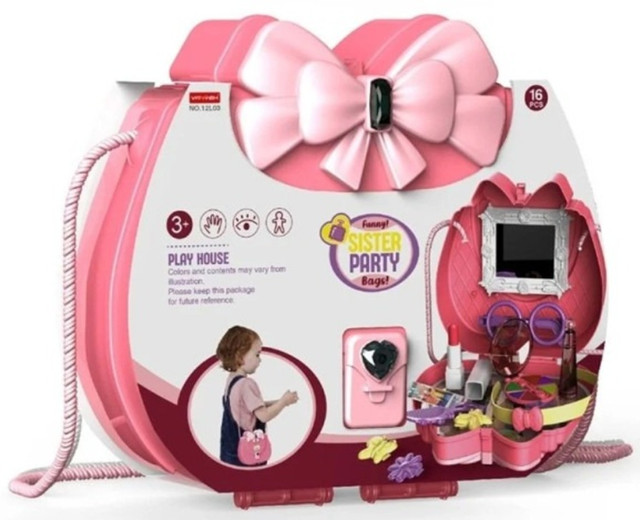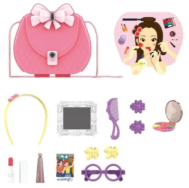 Дитячий косметичний набір сумка для макіяжу з дзеркалом Kids Pretend Toy Bag — це стильна рожева сумочка, у якій маса дев'ятних дрібниць ну, як у мами (дивися та помада, і парфуми, окуляри). Обруч, гребінець та заколочки допоможуть створити нову стильну зачіску. Дівчинка може експериментувати з образами, створюючи нові зачіски та образи перед дзеркалом. Цей ігровий набір легко взяти на прогулянку або в гості до подружки, оскільки всі аксесуари зручно поміщаються в компактну пластикову сумочку. З такою іграшкою дитина цікаво проведе час перед дзеркальцем і може взяти на прогулянку до подружки.