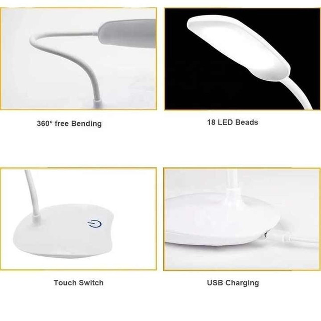 Гнучка ніжка дає змогу регулювати кут нахилу та напрямок освітлення, а сенсорне керування робить перемикання режимів зручним і швидким. Лампа підтримує 3 рівні яскравості — для читання, письма або м'якого приглушеного світла ввечері.