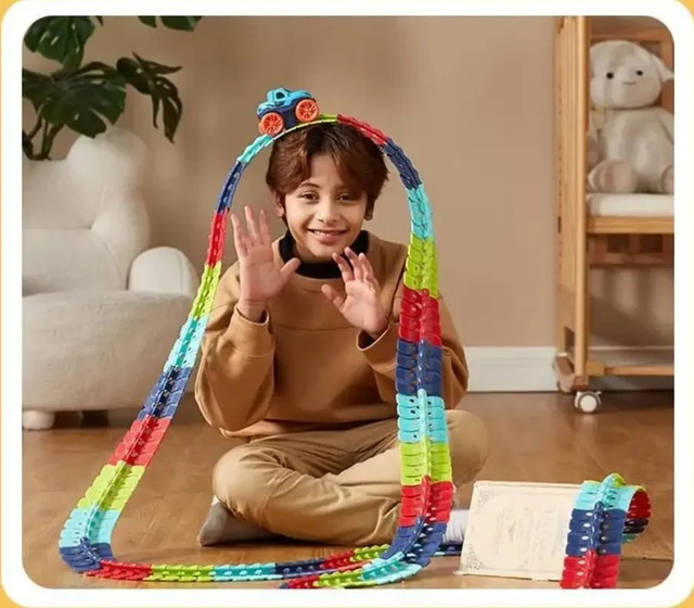 Трек сприяє розвитку моторики, мислення, розв'язанню проблем і навичок співпраці. Ця персоналізована перегонова траса стане чудовим подарунком для вашої дитини! Використовуйте предмети з дому, як-от сходи, книги, коробки або піддони, щоб будувати тунелі, пандуси та мости для нескінченних веселощів.