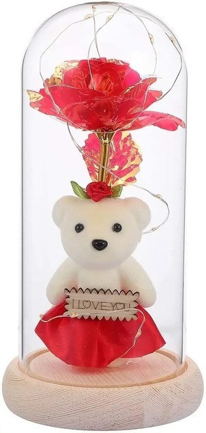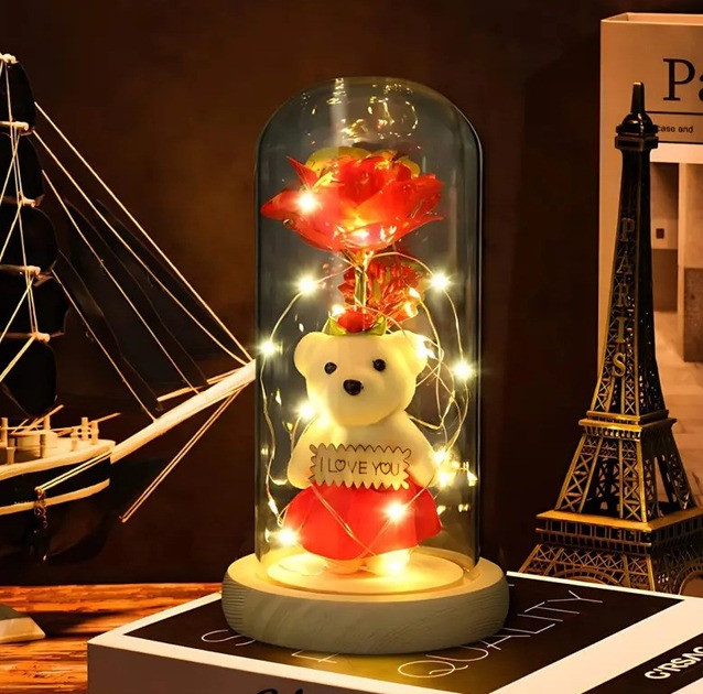 Унікальний дизайн — троянда та ведмедик у скляній колбі мають стильний та вигляд, перетворюючи нічник на гарний декоративний елемент.