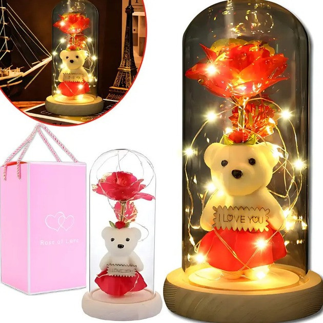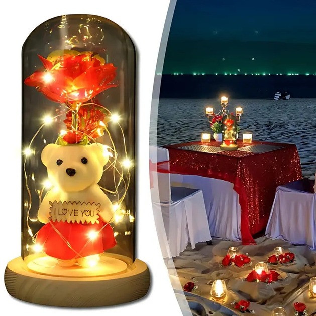 Подарунковий нічник "I Love You" у формі троянди в скляній колбі з милим ведмежам і сердечком — це не тільки джерело м'якого світла, але й стильний елемент декору. Такий сувенір ідеально підходить для подарунка дівчині, дитині або близькій людині.