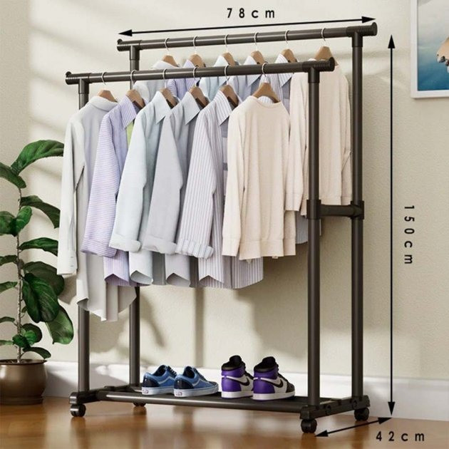 Підлогова пересувна стійка для одягу Double Pole 3 JL-DSG-8641 — практичне й універсальне рішення для зберігання й організації гардероба. Посилена телескопічна конструкція дає змогу розмістити більше речей, зберігаючи водночас компактні розміри та зручність переміщення. Коліщатка забезпечують легке транспортування навіть у разі повного завантаження, а нижня поличка підходить для взуття або дрібних аксесуарів.