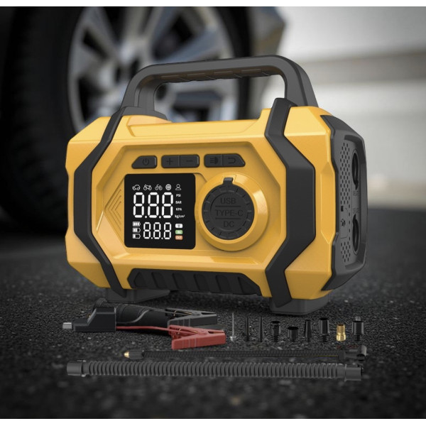 автомобільний насос з акумулятором і металевим корпусом призначений для швидкого та точного накачування шин. Пристрій обладнаний цифровим дисплеєм, який зображає поточний тиск і дає змогу автоматично встановлювати потрібні параметри. Підтримує роботу як від вбудованого акумулятора 11,1 В, так і від прикурювача, забезпечуючи універсальне використання в будь-яких умовах.