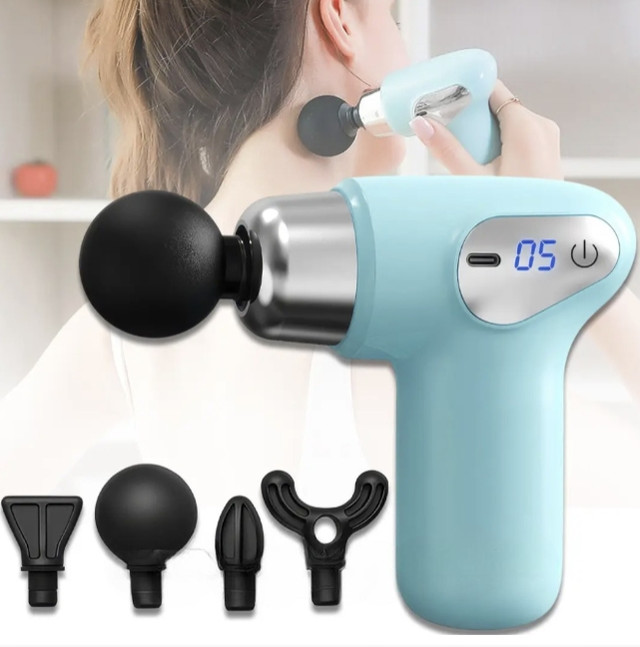 Пристрій обладнаний акумулятором, який забезпечує до 3 годин безперервної роботи, і дисплеєм для зручного керування. Ергономічна форма пістолета дає змогу комфортно використовувати масажер на будь-яких ділянках тіла — спина, шия, плечі, руки, ноги, сідниці, стопи.