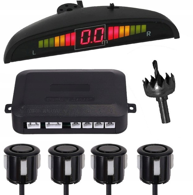 Парковочная система Car Radar Parking — современное устройство, которое помогает безопасно и быстро парковать автомобиль даже в ограниченном пространстве. Система включает 4 черных датчика, блок управления и LED-дисплей для визуальной и звуковой индикации препятствий.