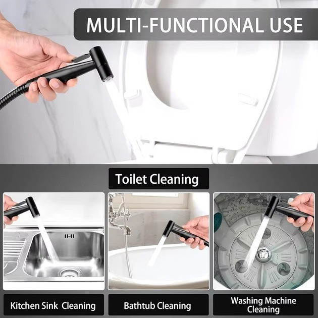 Цей аксесуар універсальний: підходить для особистої гігієни, миття унітаза, догляду за тваринами та навіть для ручного прання. Мінімалістичний дизайн і чорне виготовлення роблять його стильним доповненням інтер'єру ванної кімнати.