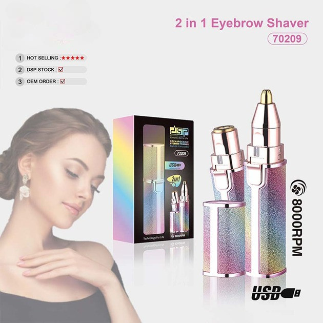 Тример для брів DSP 70209 USB — це удТ— особливий і безпечний пристрій для точного догляду за бровами та видалення небажаного волосся на обличчі та тілі. Жіноча акумуляторна бритва-тример дає безболісно й акуратно позбутися зайвих волосків, не викликаючи подразнення й алергії.