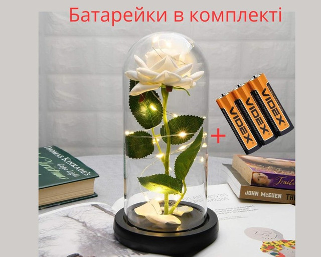Троянда біла декоративна в скляній колбі з LED-підсвіткою й батарейками