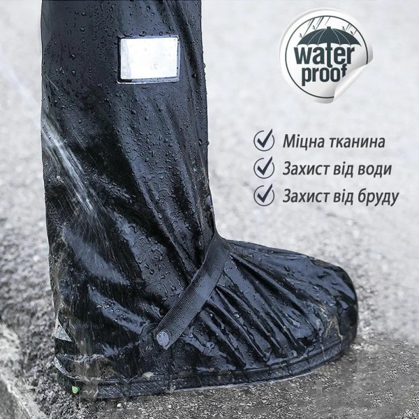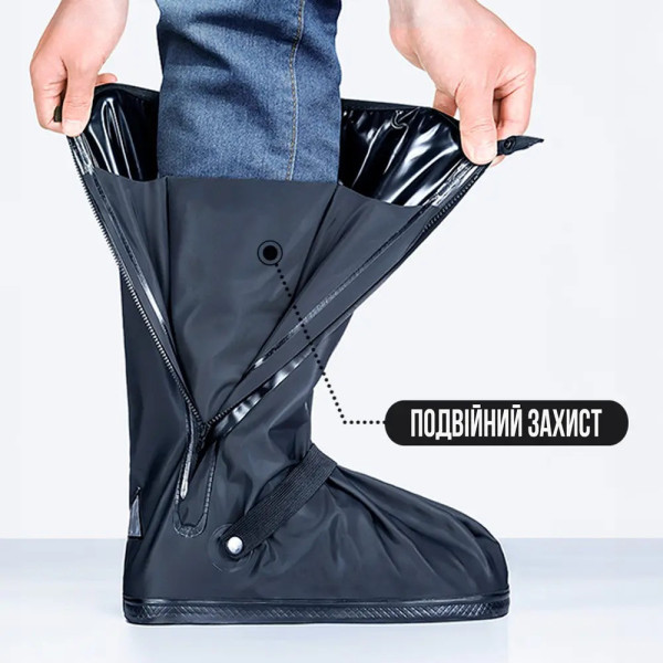Виготовлені з міцного та зносостійкого ПВХ-матеріалу із захистом від ультрафіолету, бахіли стійкі до пошкоджень і довговічні у використанні. Герметичні пропаяні шви надійно з'єднують верх із підошвою, запобігаючи протіканню. Антиковзна гумова підошва забезпечує стійкість на мокрих і слизьких поверхнях, а додатковий ПВХ-вставка під блискавкою захищає ноги від попадання води.