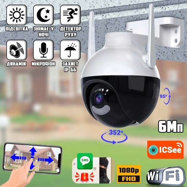 Вулична IP-камера 6 МП поворотна CAMERA CAD N6 iCSee, Wi-Fi, інфрачервона, з мікрофоном і хмарним зберіганням