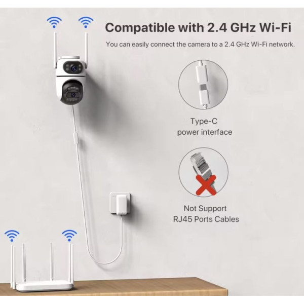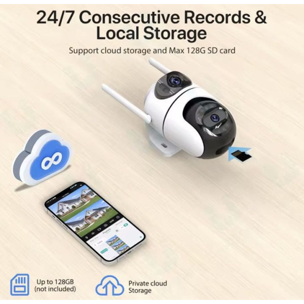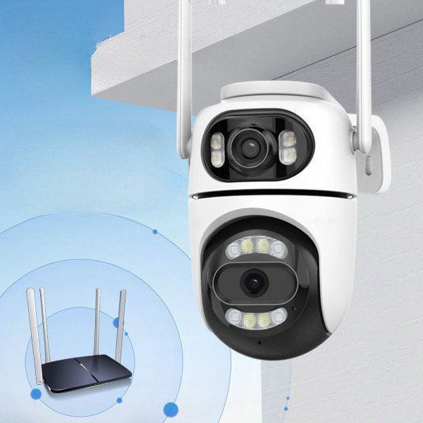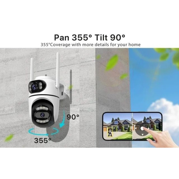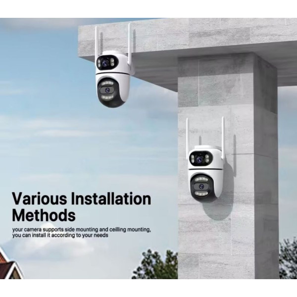 Вулична бездротова Wi-Fi IP-камера PTZ з двома об'єктивами — ідеальне рішення для безпечного та зручного відеоспостереження за будинком, дачі, гаражем або паркуванням. Ця камера замінює відразу дві-три звичайні стаціонарні камери завдяки вбудованому подвійному модулю: одна камера стаціонарна, друга поворотна.